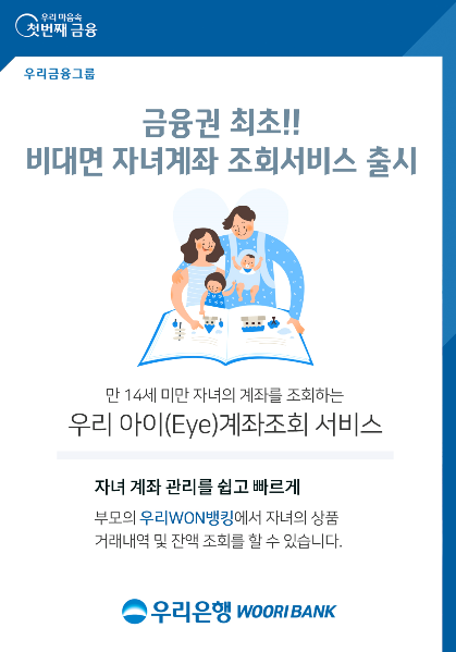 우리금융지주의 자회사 우리은행(은행장 권광석)은 금융권 최초 비대면으로 부모가 자녀의 계좌를 조회할 수 있는‘우리 아이(Eye) 계좌조회 서비스’를 출시했다고 8일 밝혔다.